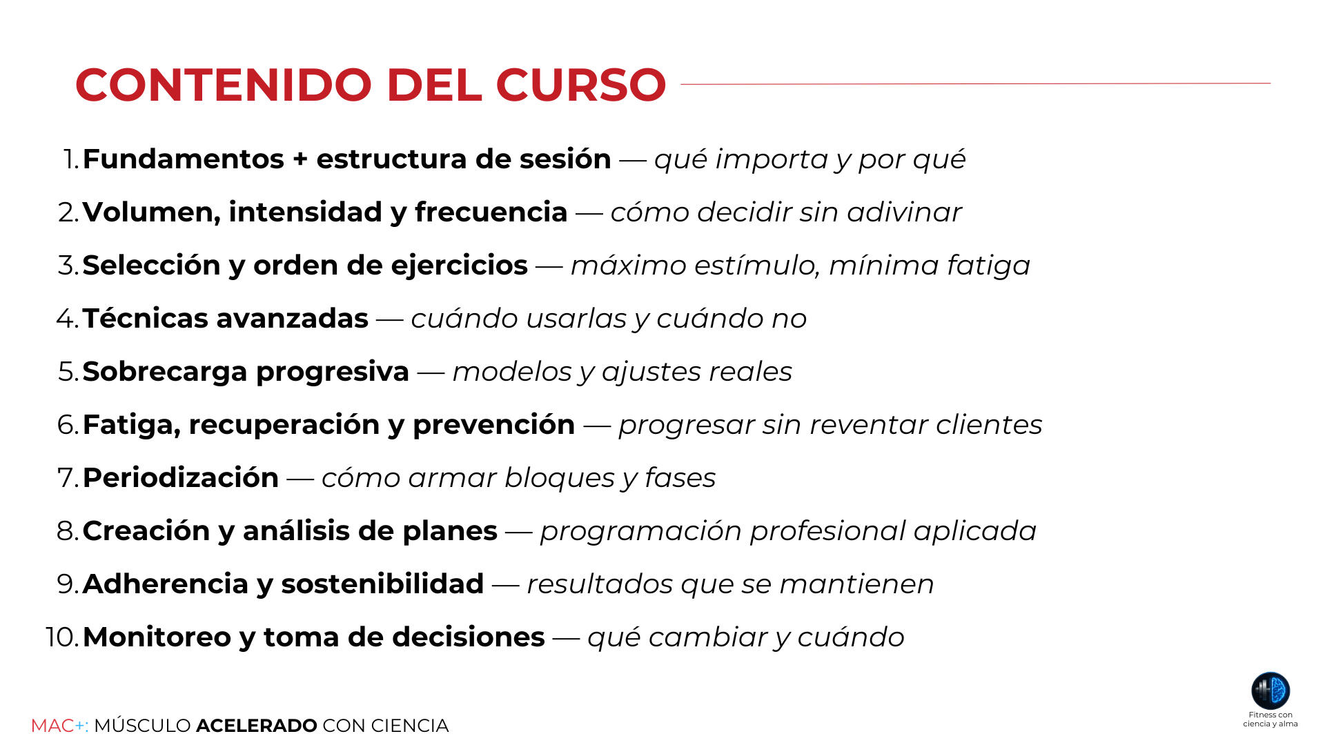 Casos reales (principiante, intermedio, avanzado) → aprendes a adaptar el sistema a perfiles diferentes → creas planes de entrenamiento de acuerdo al contexto de cada cliente.
